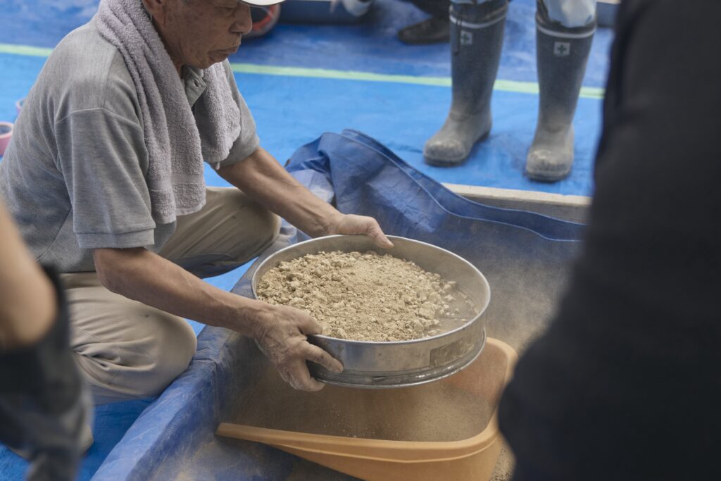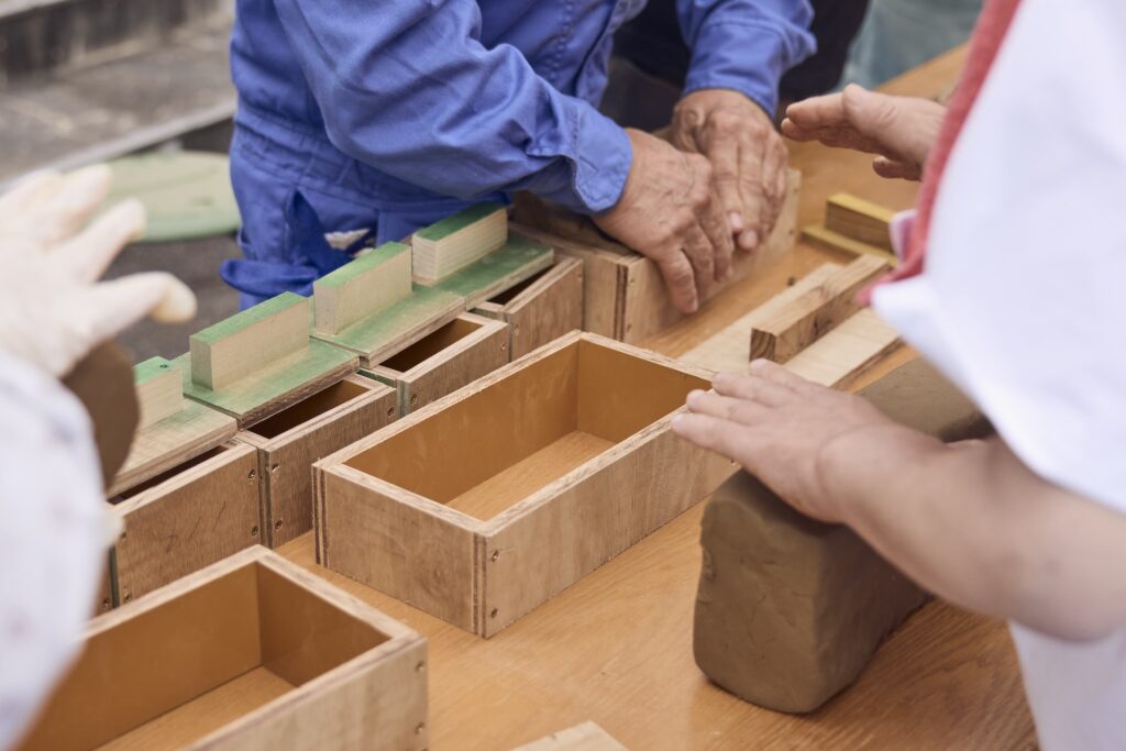 ワークショップでは、粘土を細かく「砕く」、砂状になった粘土を水と合わせて「こねる」、最後に木枠に「詰める」という三つの工程を行い、それぞれ自由に取り組んでいただきました。