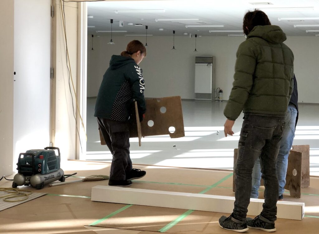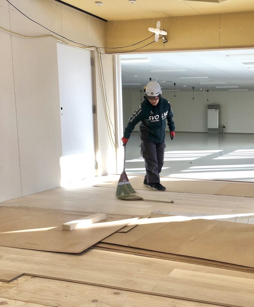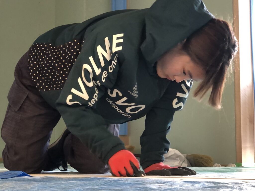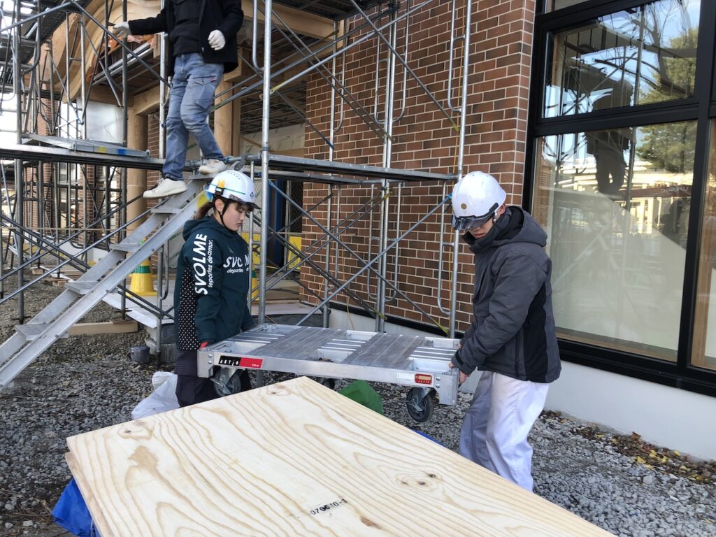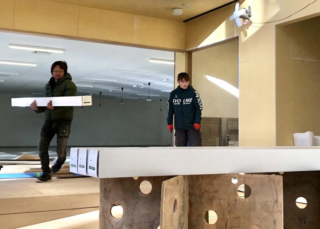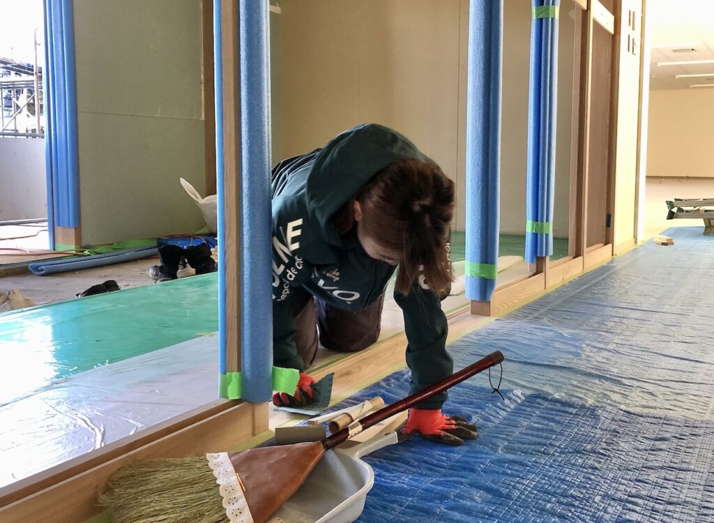 進行中の現場の一つ、永祥寺様の納骨堂建設で床貼りなど内装の仕上げを手伝ってくれています。