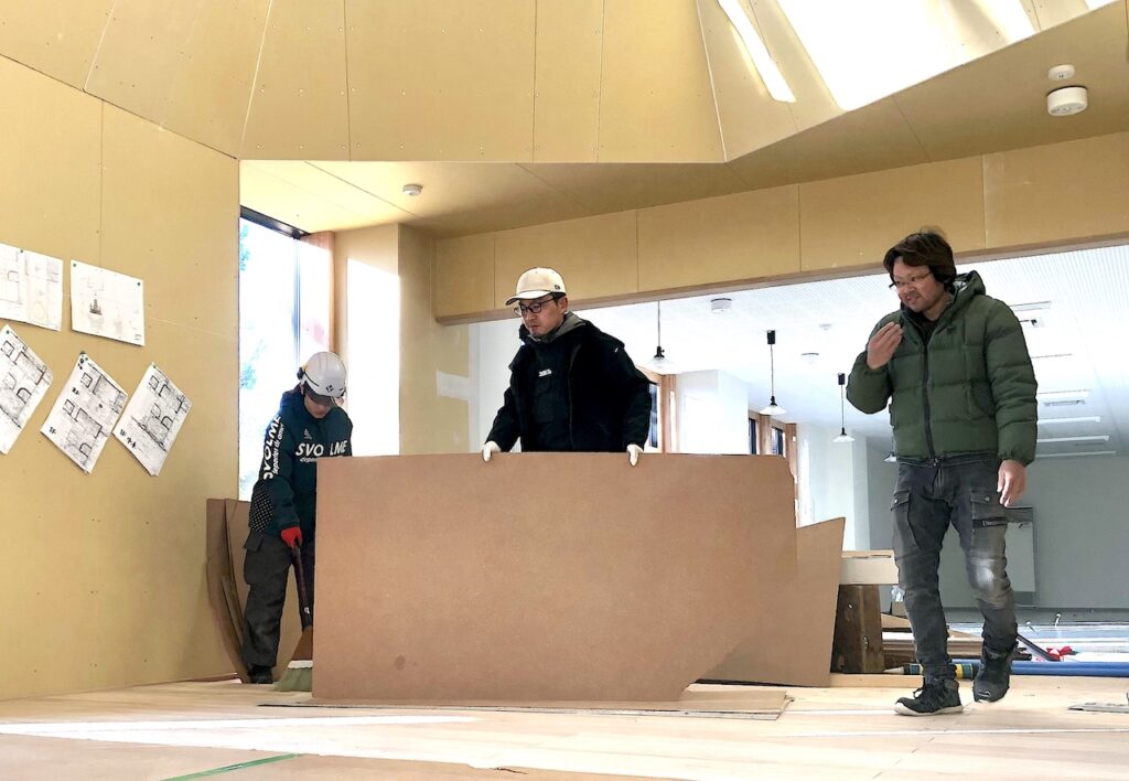 進行中の現場の一つ、永祥寺様の納骨堂建設で床貼りなど内装の仕上げを手伝ってくれています。