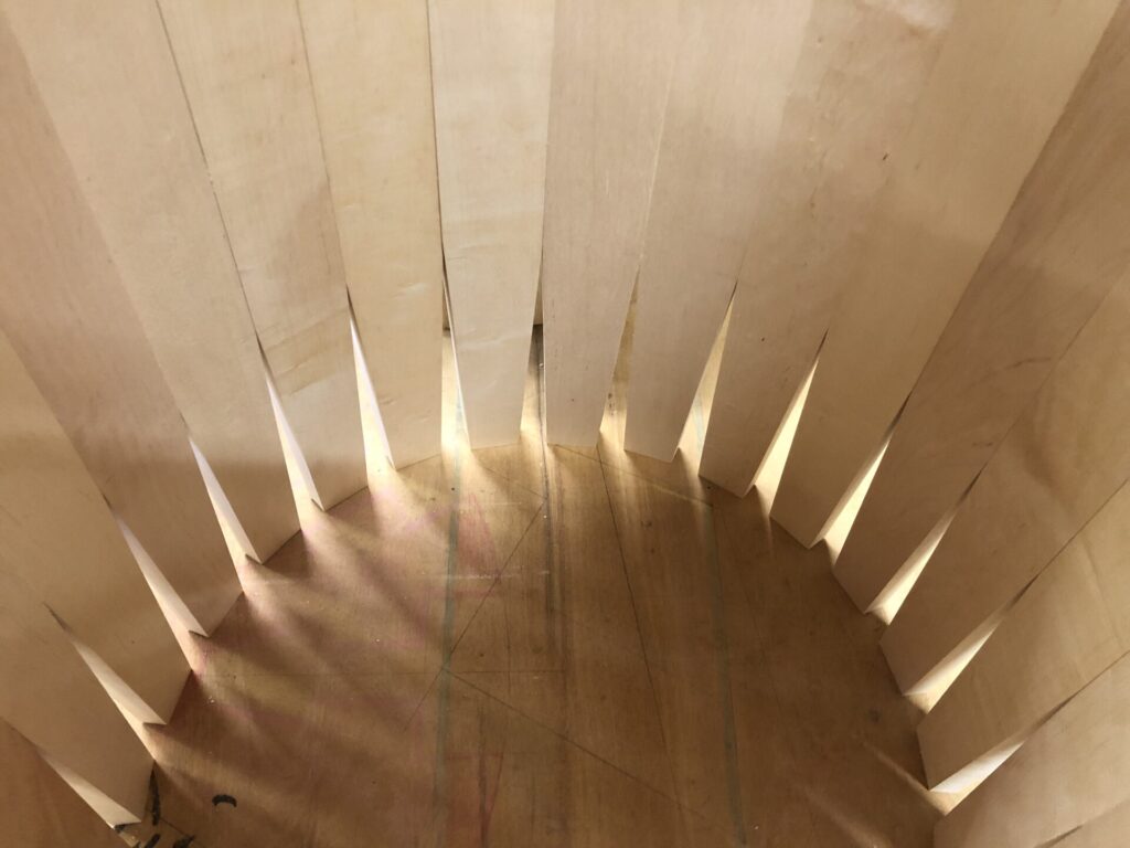 10リットルサイズの短い材料を曲げることは難しい挑戦でしたが、木を高温で蒸して曲げる曲木工法を用いて工夫を重ねました。